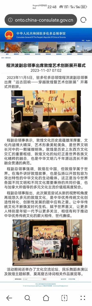 2023年11月5日位于加拿大多伦多市中心的罗伊·汤姆森内呈现出与平日迥异的布置。色彩鲜明的飞天、菩萨等东方佛国元素出现在厅内的巨幅挂画、铺满地面和包裹着柱子的大小画作中。一场展示敦煌元素以及中西结合的创新表现力的艺术展在此举行。